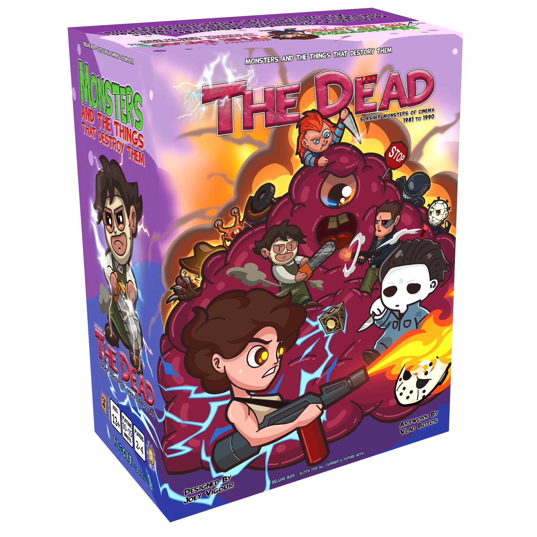 The third cycle of the “Monsters” series features the cinematic ‘slashers’ of 1981-1990. All monsters and tactical cards (neutralizers) have unique powers from the other cycles. This third set adds a neutral area called the Dead Zone, which represents a parallel dimension, dream realm, or comatose hallucination. The Dreamstalker can trigger a card in the dead zone, the chainsaw-wielding Butcher or the machete-wielding Slasher can send monsters there, and Reanimation Serum can bring back a monster.
